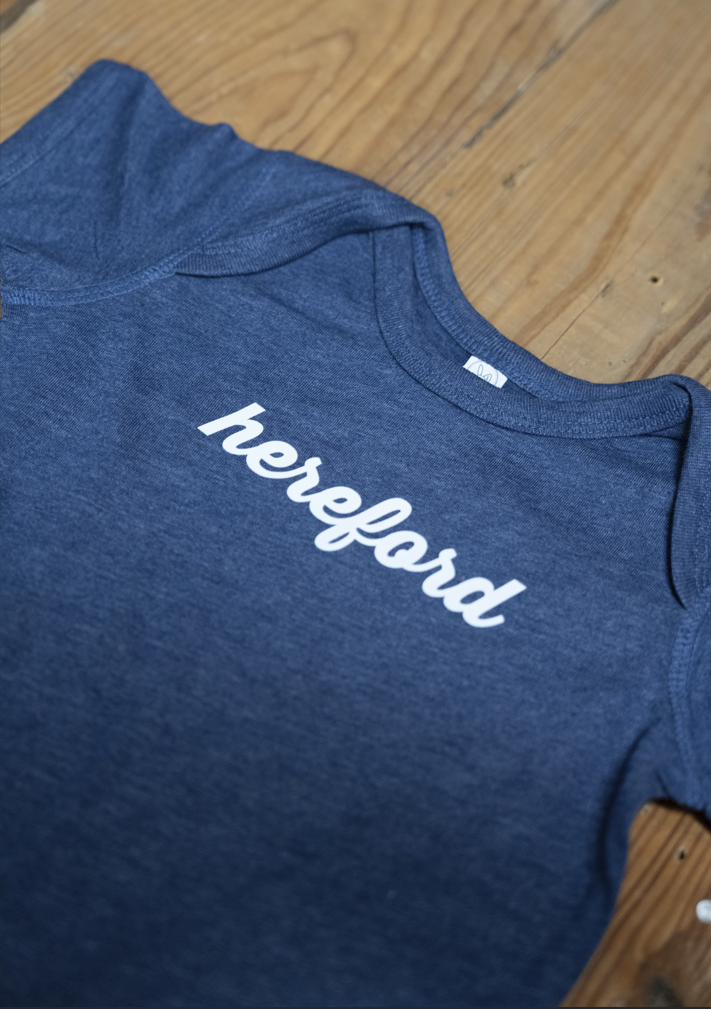 Dress your little one in adorable Hereford gear with this navy blue baby onesie. Featuring “Hereford” in script font across the front and the AHA logo imprinted on the back of the neck, it’s soft, comfortable, and perfect for everyday wear.